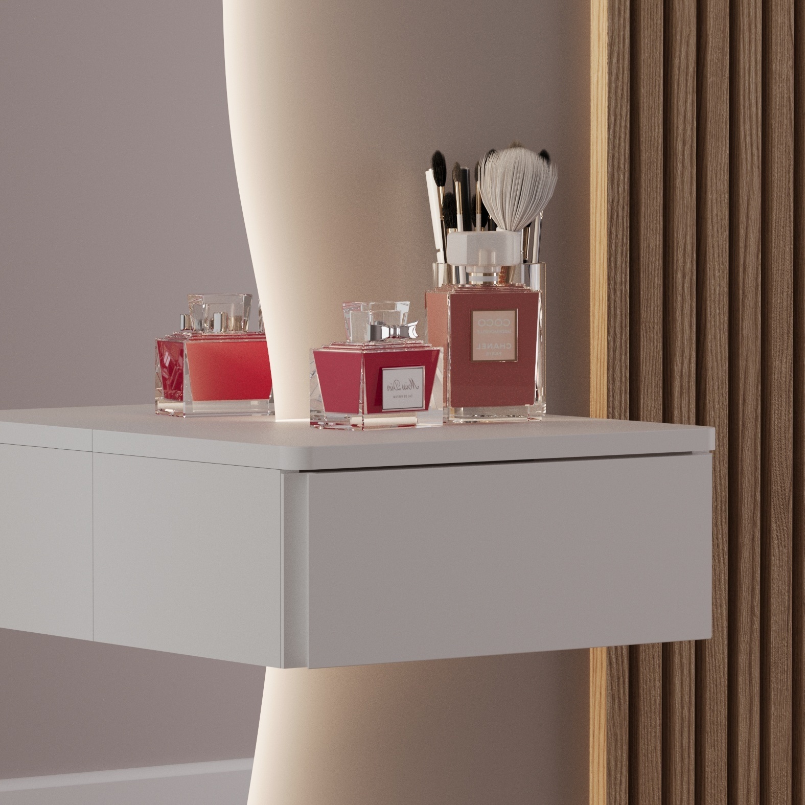 В комплект входит стильная подвесная тумба, идеально сочетающаяся с зеркалом. Она оснащена выдвижным ящиком с механизмом плавного закрывания — практичное и элегантное решение для хранения. Крепление к стене обеспечивается интеграцией с несущей конструкцией зеркала, что гарантирует устойчивость и длительный срок службы.