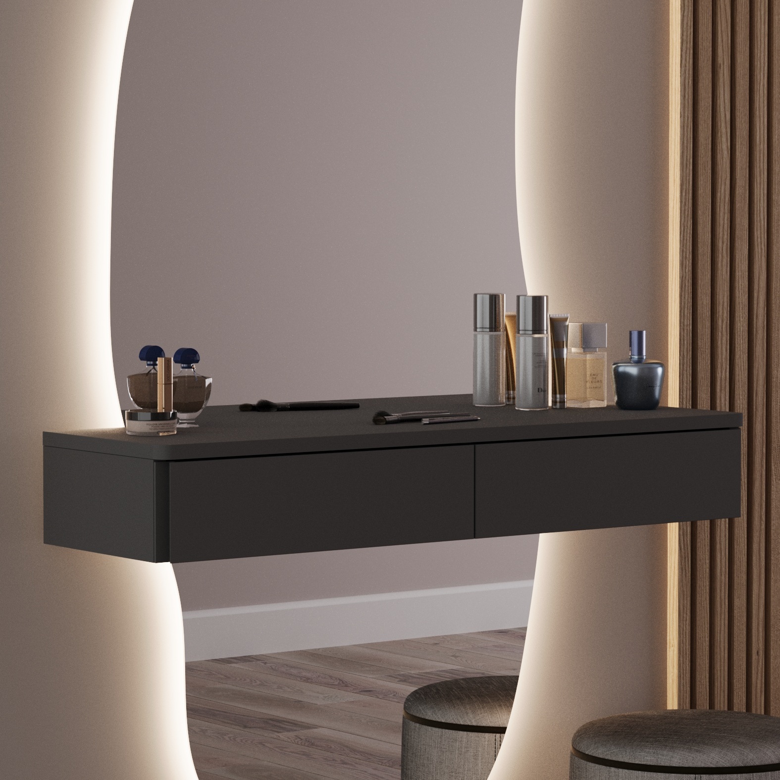 В комплект входит стильная подвесная тумба, идеально сочетающаяся с зеркалом. Она оснащена двумя выдвижными ящиками с механизмом плавного закрывания — практичное и элегантное решение для хранения. Крепление к стене обеспечивается интеграцией с несущей конструкцией зеркала, что гарантирует устойчивость и длительный срок службы.