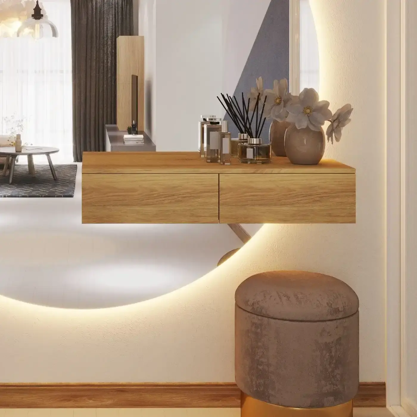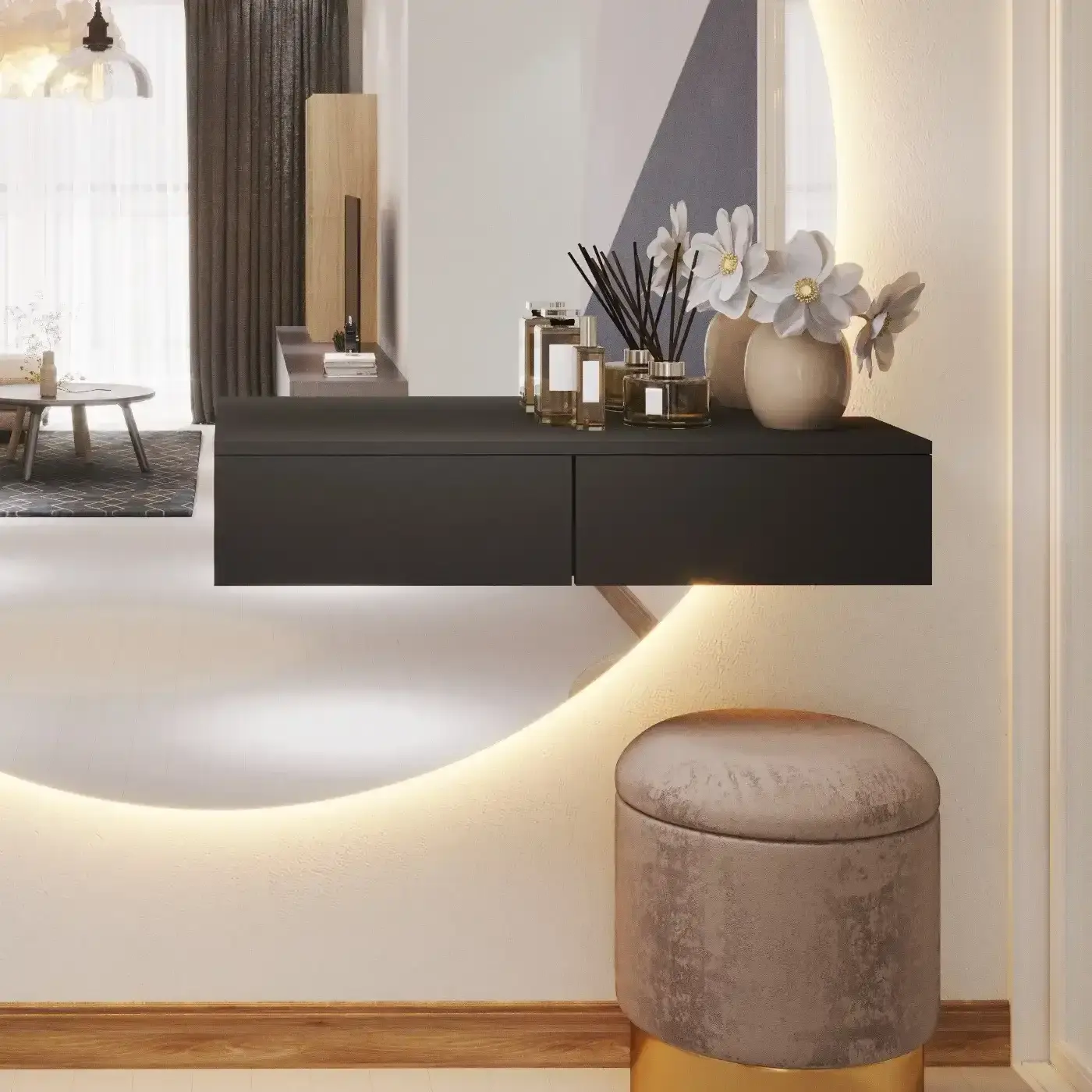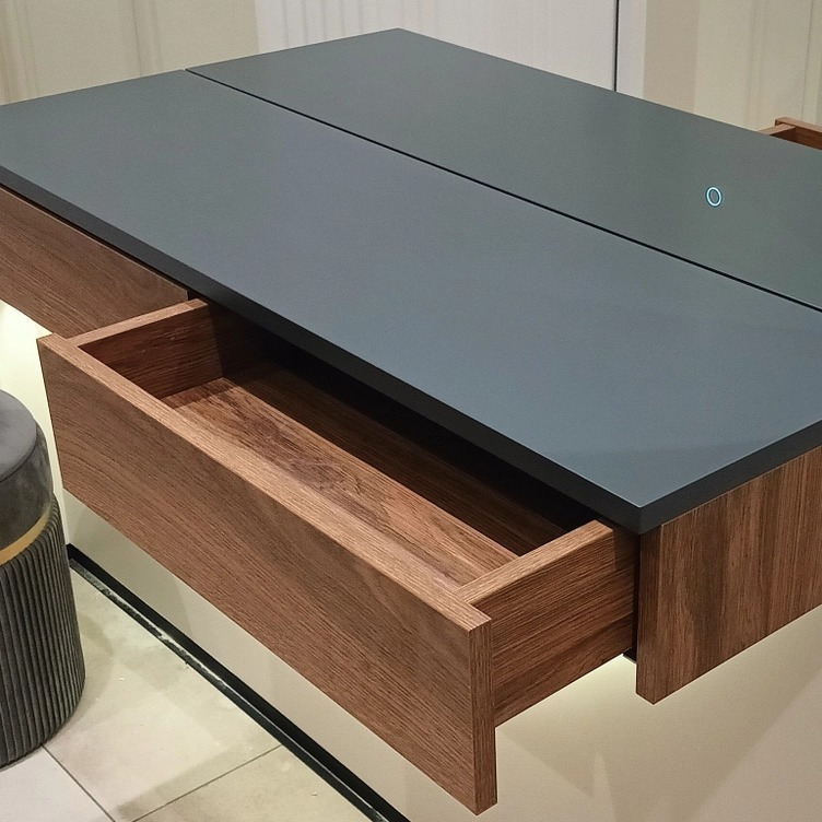 В комплект входит стильная подвесная тумба, идеально сочетающаяся с зеркалом. Она оснащена двумя выдвижными ящиками с механизмом плавного закрывания — практичное и элегантное решение для хранения. Крепление к стене обеспечивается интеграцией с несущей конструкцией зеркала, что гарантирует устойчивость и длительный срок службы.