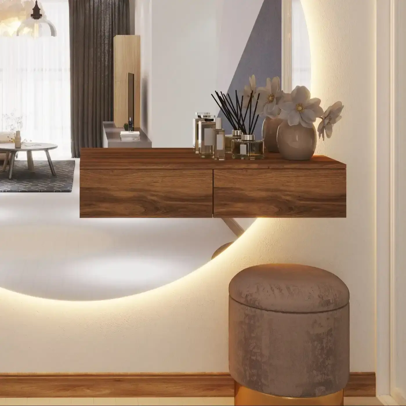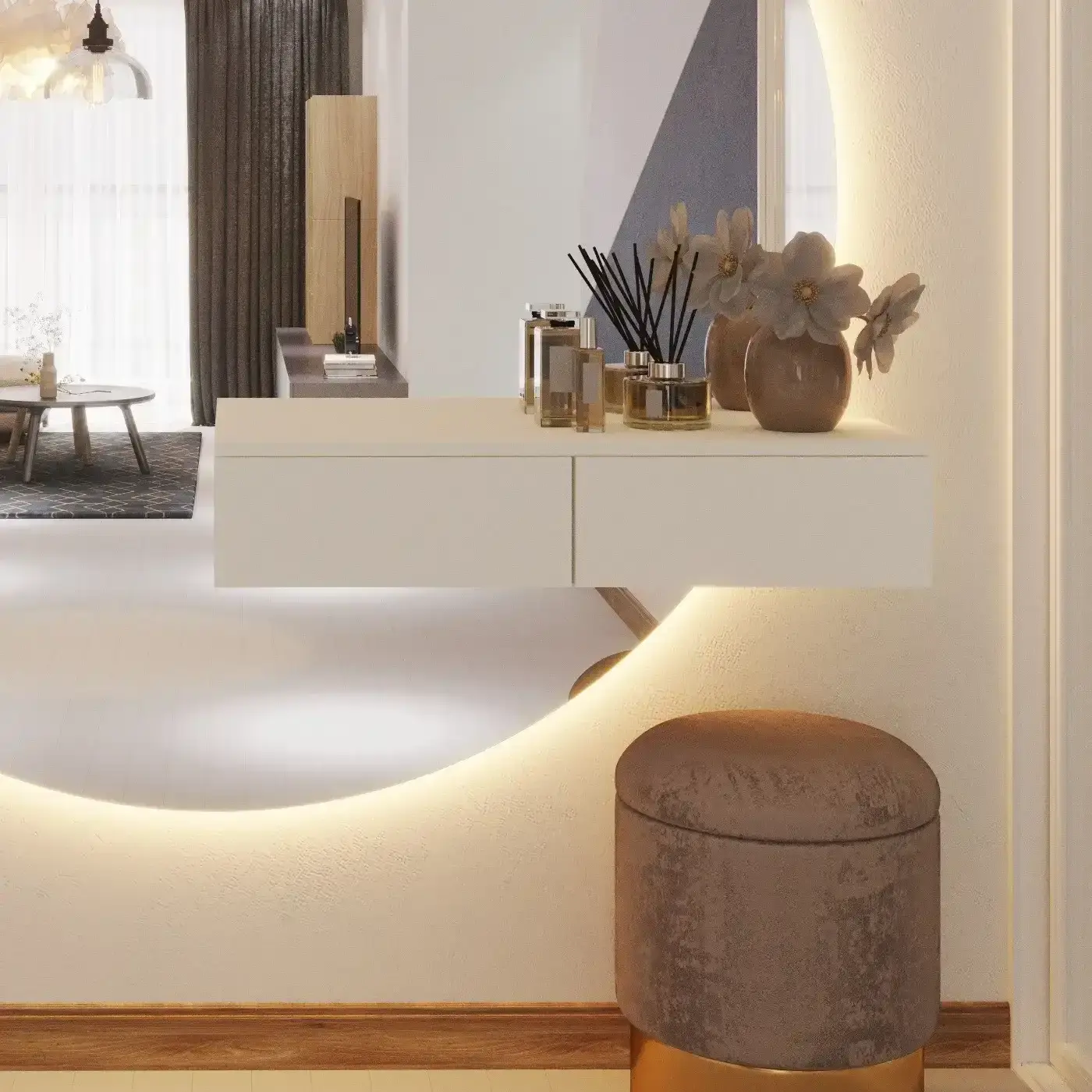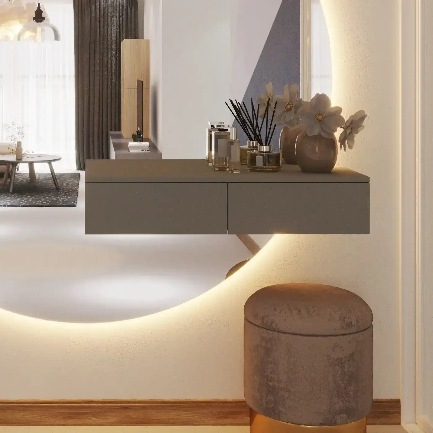 В комплект входит стильная подвесная тумба, идеально сочетающаяся с зеркалом. Она оснащена двумя выдвижными ящиками с механизмом плавного закрывания — практичное и элегантное решение для хранения. Крепление к стене обеспечивается интеграцией с несущей конструкцией зеркала, что гарантирует устойчивость и длительный срок службы.