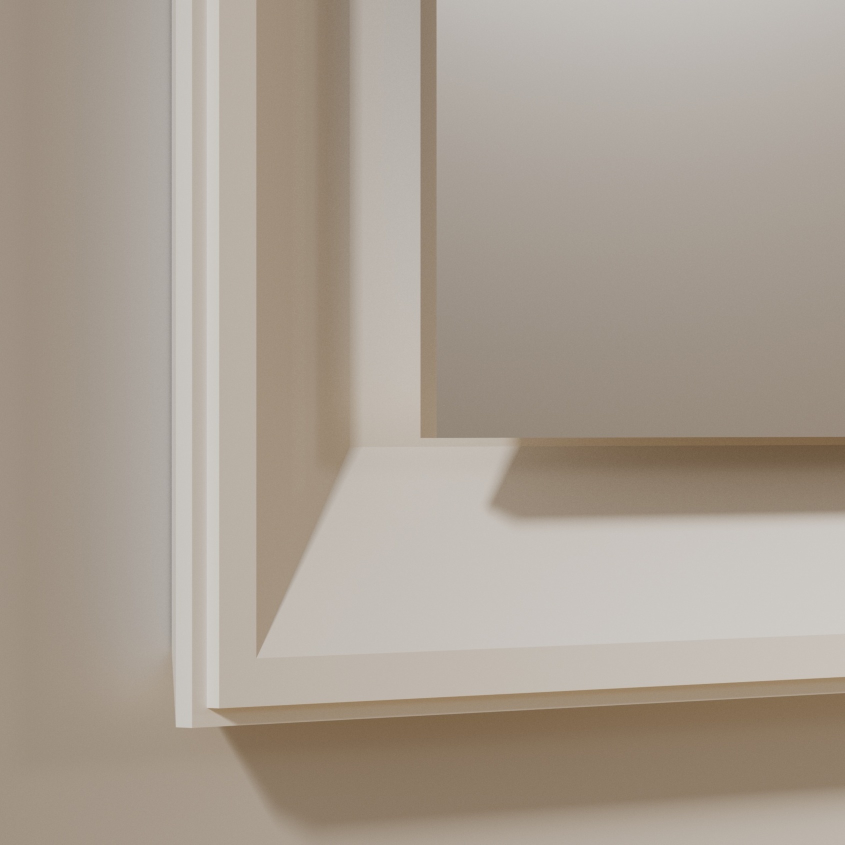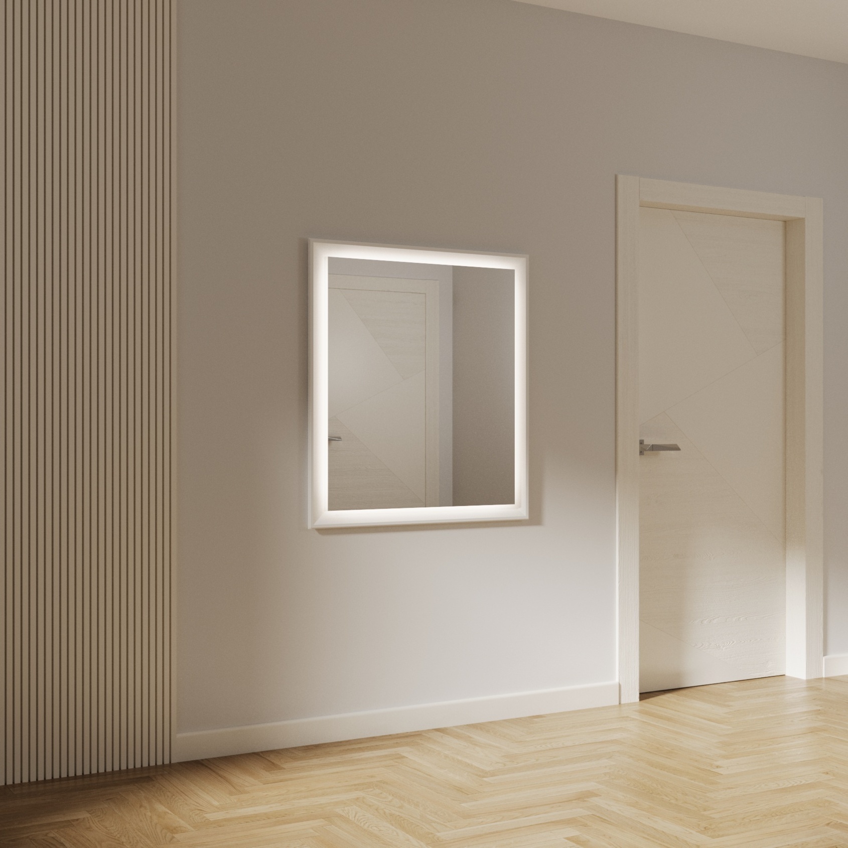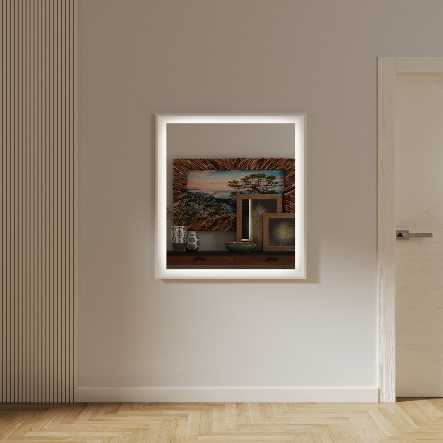 Зеркало оснащено декоративной рамой, которая подчёркивает его геометрию и придаёт конструкции завершённый вид. LED-подсветка размещена между зеркальной поверхностью и рамой, создавая эффект парящей глубины и мягкого рассеянного света.